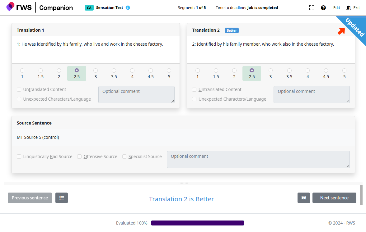 To progress through the segments, the evaluator must perform the evaluation and then select Save and Next. The Previous sentence button can be used to go back and review previously evaluated segments, but these segments will no longer be editable.