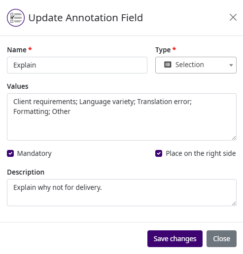 For Selection type fields, a semicolon-separated list of selectable values (e.g. Client requirements; Language variety; Translation error; Formatting; Other). |