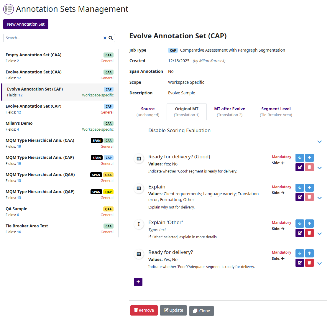 Clone — creates a copy of the selected annotation set, which can then be modified independently.